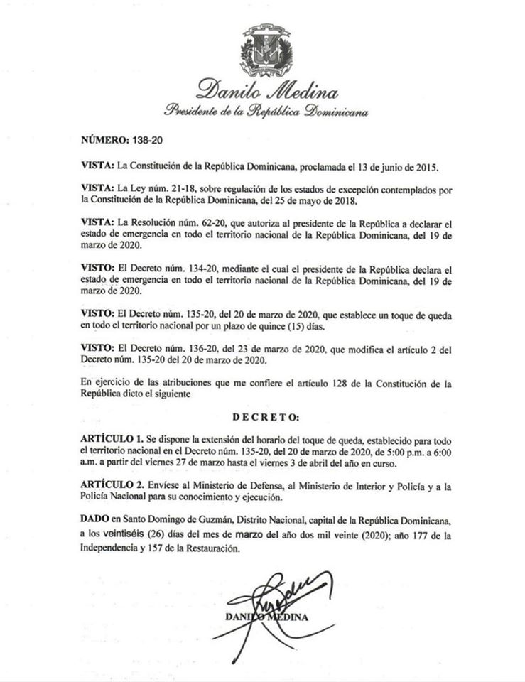 DIARIO VISION.-Santo Domingo.-El Presidente @DaniloMedina extiende mediante decreto horario del toque de queda a partir de mañana viernes 27 de marzo hasta el viernes 3 de abril. El nuevo horario del toque de queda será:Desde las 5:00 de la tarde hasta las 6:00 de la mañana.