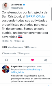 diariovision.do Santo Domingo.- El Partido Revolucionario Moderno (PRM) suspendió todas sus actividades proselitista de este fin de semana en solidaridad a las personas fallecidas en la explosión que dejó al menos 27 muertos y más 50 heridos en una zona comercial de la ciudad de San Cristóbal.