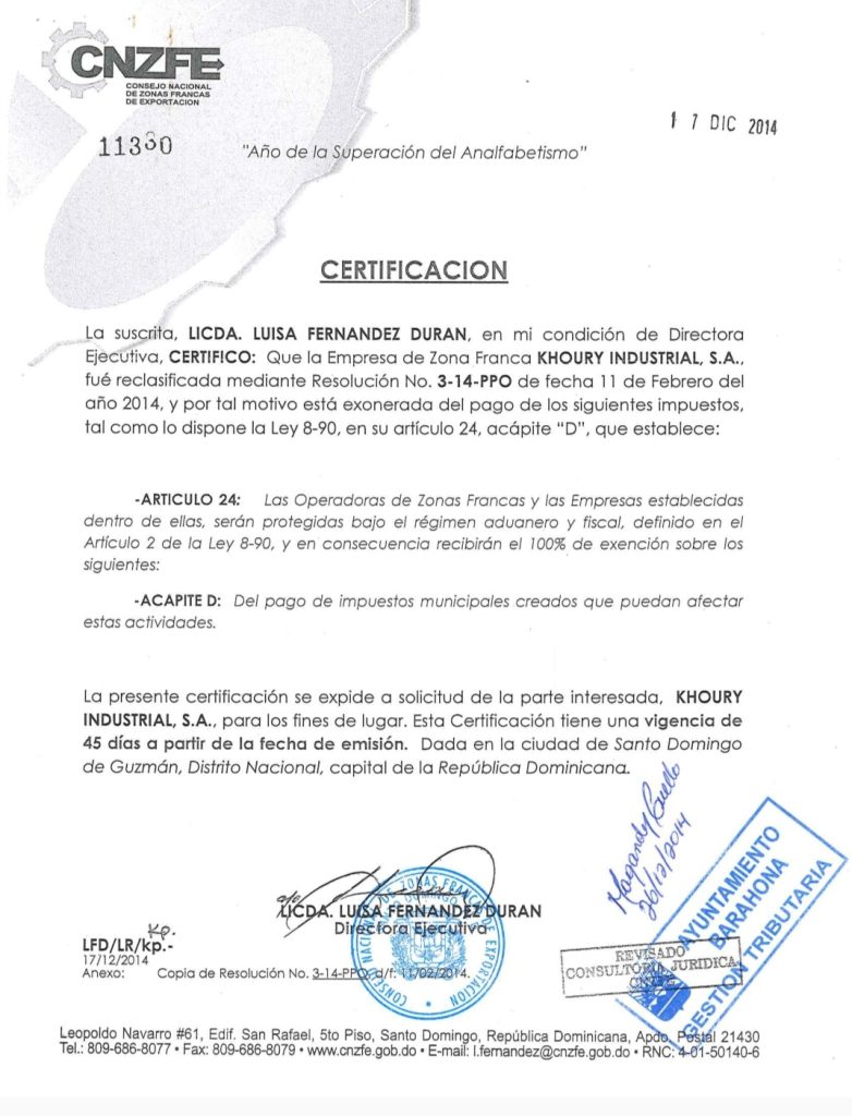 En una certificación emitida por Consejo Nacional de Zonas Francas de Exportación en 2014, establece que Khoury Industrial, fué reclasificada mediante resolución Número 3-14-PRO de fecha 11 de febrero de 2014 y qué por tal motivo está exonerada del pago de impuestos municipales que puedan afectar sus actividades y operaciones.