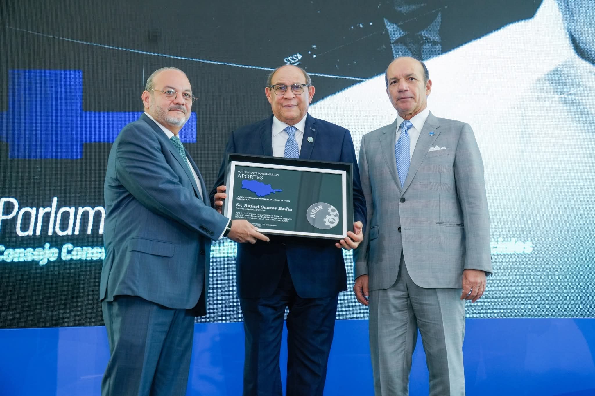 Diariovision.-Santiago. -La Asociación de Industriales de la Región Norte (AIREN) otorgó un reconocimiento al profesor Rafael Santos Badía, director general del Instituto Nacional de Formación Técnico Profesional (INFOTEP), por su liderazgo y compromiso con la formación técnico y el desarrollo del talento humano, impulsando la industria nacional.