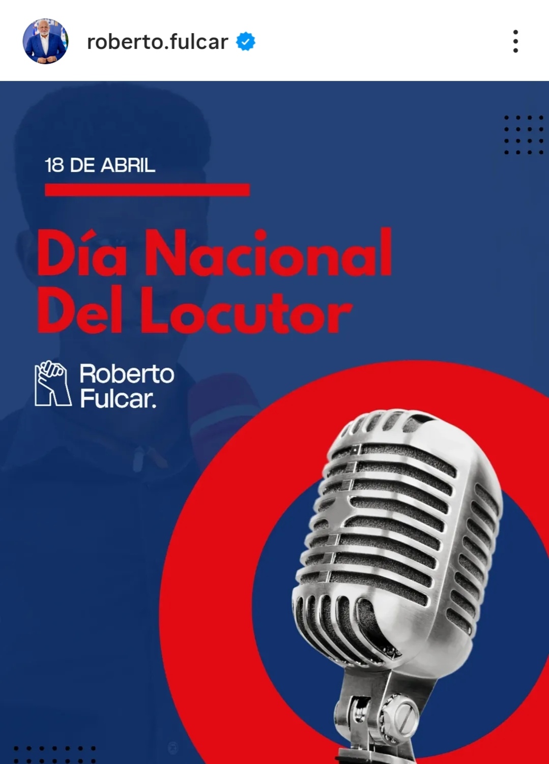 DIARIOVISION.- Santo Domingo.- Al conmemorarse este 18 de abril, el día nacional del Locutor, el dirigente político del oficialista Partido Revolucionario Moderno (PRM), Roberto Fulcar, felicitó a los locutores dominicanos y resaltó el trabajo de orientación, educativo y entretenimiento que realizan a favor de la ciudadanía.